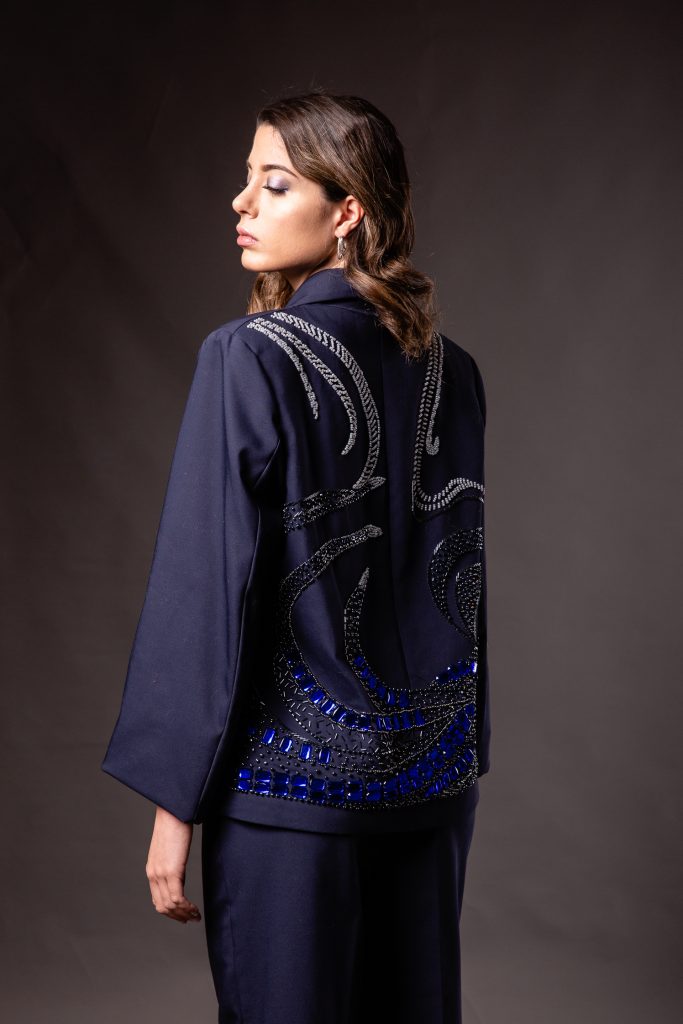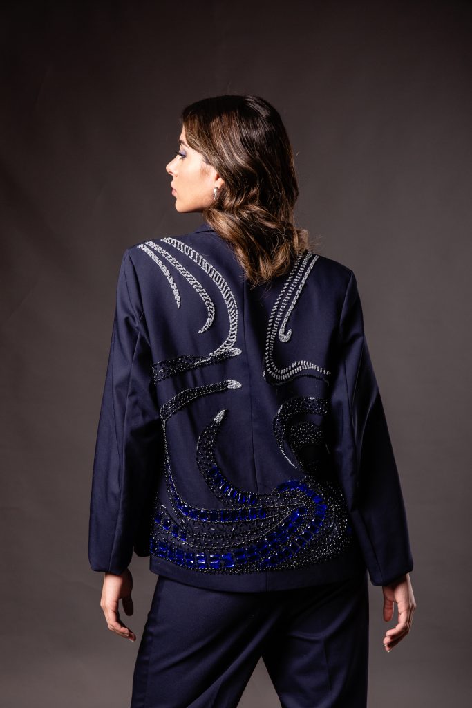 Ως λάτρης της ιστορίας της τέχνης και των καλών τεχνών, προσανατολίζεται σχεδιαστικά με πυξίδα τη ζωγραφική. Έτσι, για το Fashion Vibes project, δανείστηκε στοιχεία από τον διάσημο πίνακα του Κατσουσίκα Χοκουσάι, «Το μεγάλο κύμα έξω από την Καναγκάβα», με βάση το Edo, το κιμονό της τότε εποχής της Ιαπωνίας. Θέλοντας ωστόσο να εντάξει στα σχέδιά της και το ελληνικό στοιχείο, άντλησε πληροφορίες από τους πίνακες του σπουδαίου Έλληνα ζωγράφου Γιάννη Τσαρούχη, και τους ναύτες μας, καταλήγοντας στη χρήση στοιχείων της στολής τους (τετράγωνη λαιμόκοψη, λευκές γραμμές, μπλε κολαρίνα, μαύρο μαντήλι, σχοινί). Η χρωματική παλέτα προκύπτει από τον πίνακα του Χοκουσάι, ενώ το καρό, που είχε έντονη παρουσία στην περίοδο Edo, εμπλουτίστηκε με τρεις λευκές γραμμές, προκειμένου να παραπέμψει στη ναυτική επιρροή. Όσον αφορά στο κόσμημα, διακοσμεί τα ρούχα είτε με τη μορφή κεντήματος, είτε ως τύπωμα, που σχηματίζεται με την εναλλαγή των χρωμάτων στην επιφάνεια του καρό.