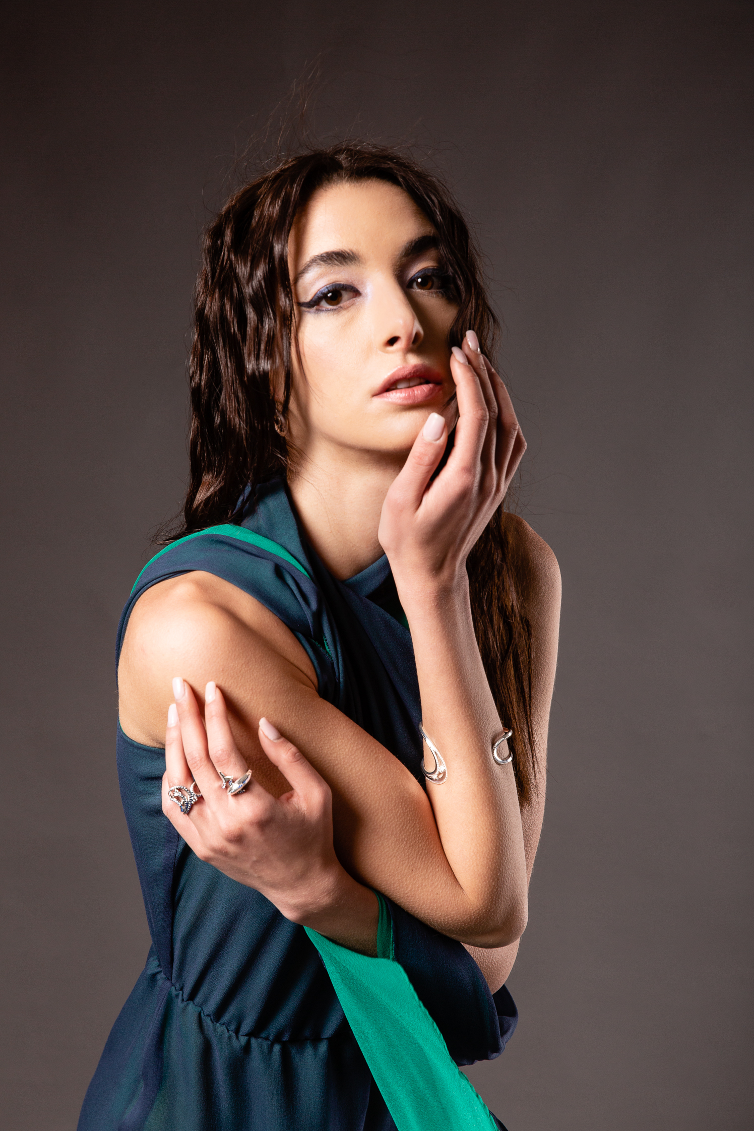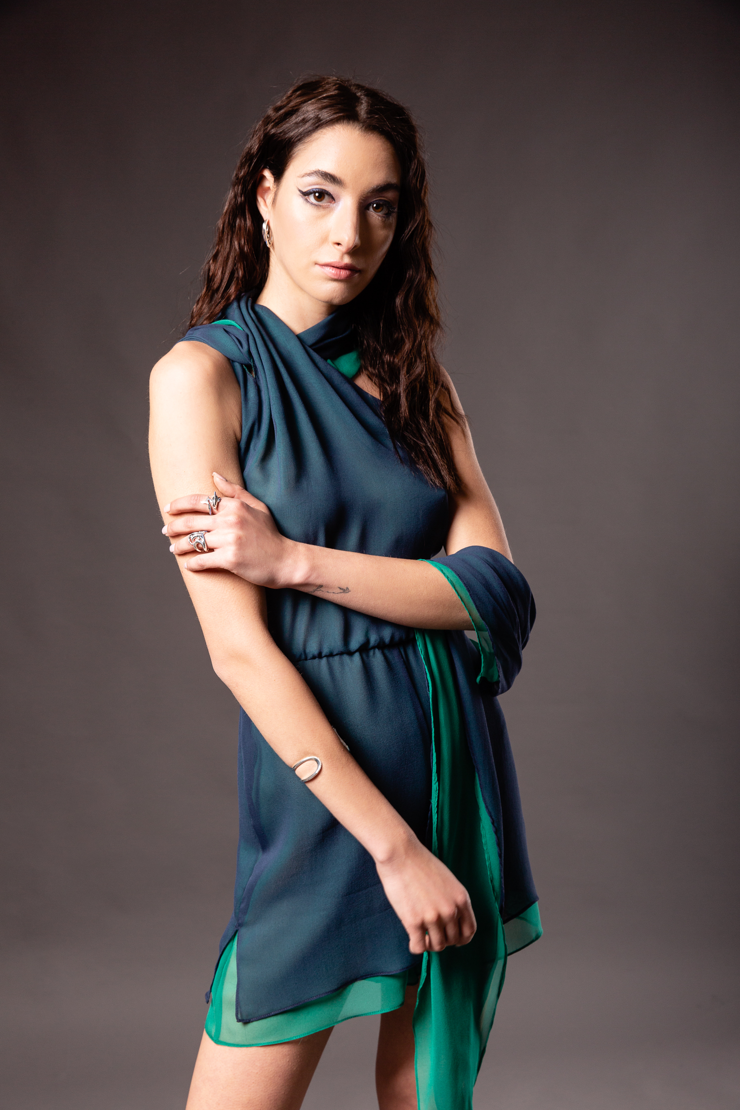 Το σχέδιο που παρουσιάζει, εμπνευσμένο από τη σειρά Ocean Vibes της THOMAS SABO, αποτελείται από μια ολόσωμη φόρμα, κατασκευασμένη από μεταξωτό σιφόν. Είναι διπλά ραμμένη ώστε να μην είναι διαφανής και να ταιριάζει απόλυτα με το κολιέ του κύματος, το χρώμα της θάλασσας και τα layers που χρησιμοποιεί η THOMAS SABO.